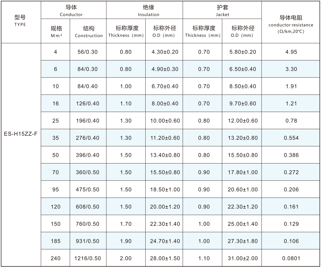 The conductor adopts IEC60228-2004 standard Class 5 or Class 6 conductor 4.0-240mm2 tin plated or bare copper
