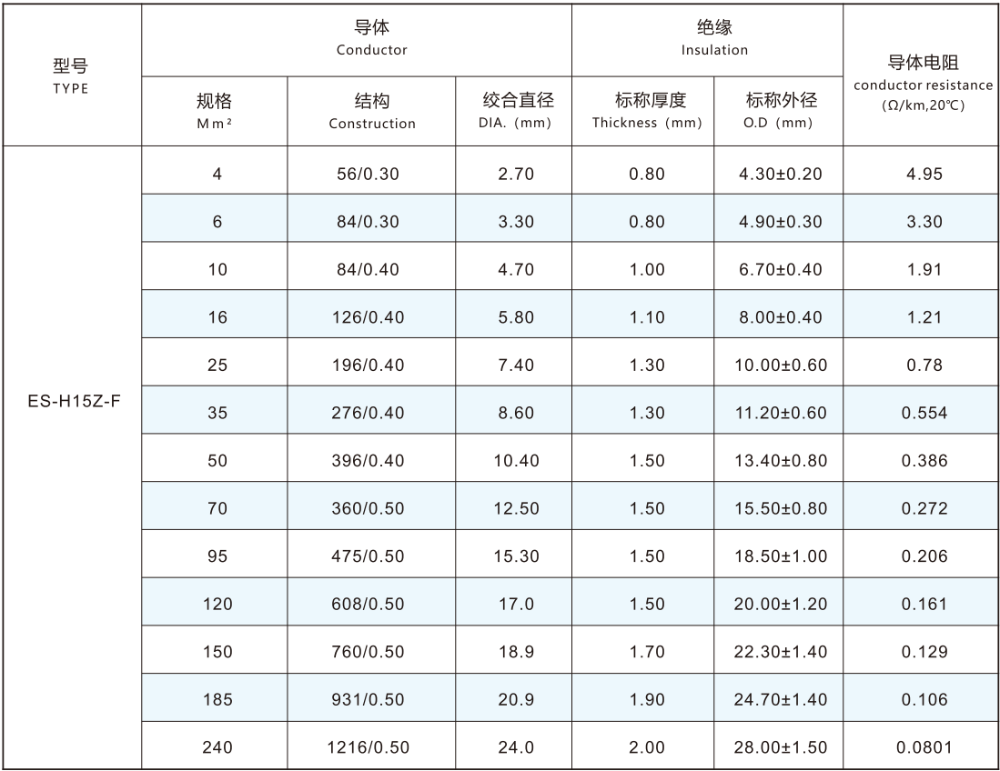 The conductor adopts IEC60228-2004 standard Class 5 or Class 6 conductor 4.0-240mm2 tin plated or bare copper