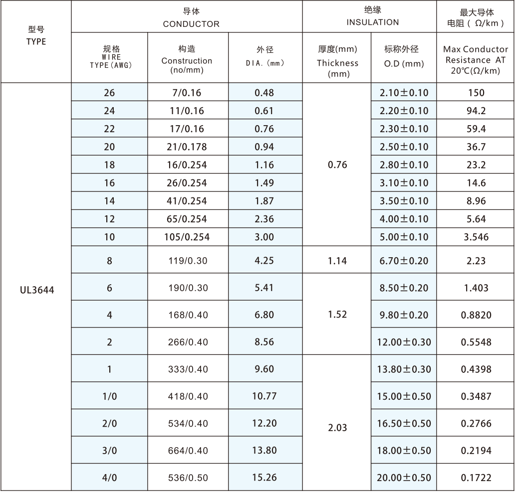 The conductor is made of single or twisted 30-4/0AWG tinned or bare copper wire